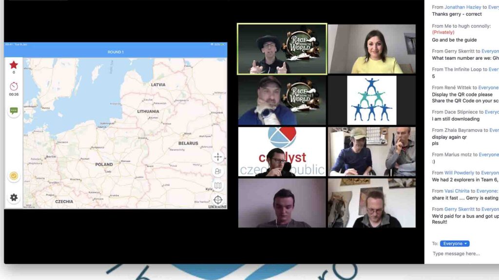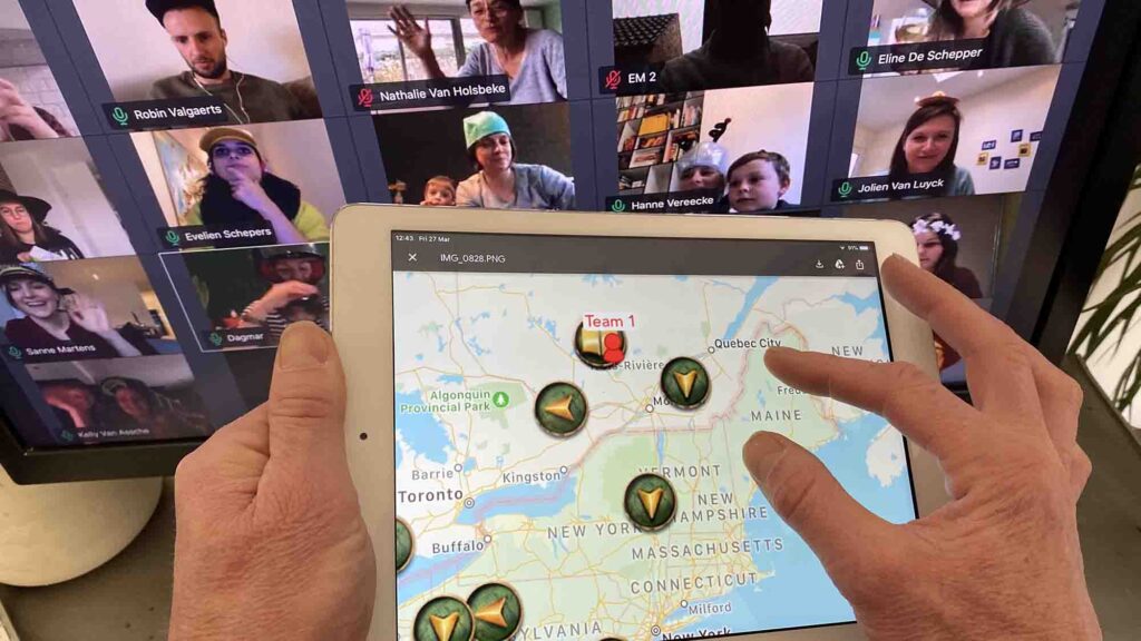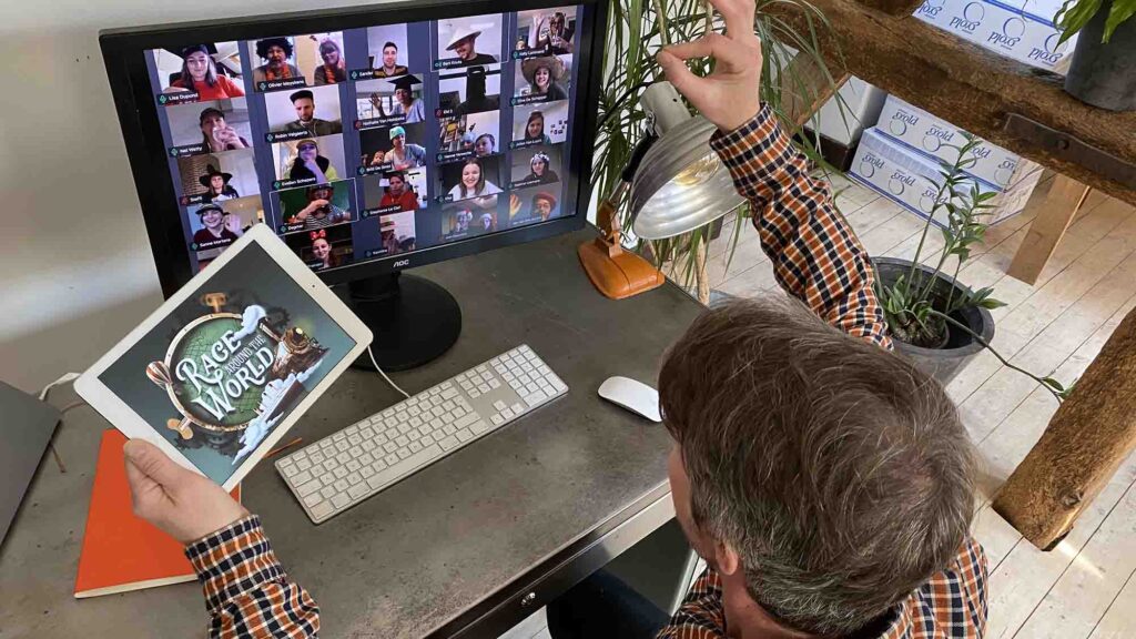 In this version, teams find that actively listening to receive and interpret messages, watching for facial cues and communicating precisely are all keys to success. The Race Around the World has three levels, each with a variety of engaging interactive team challenges. Each group chooses an explorer. Players then collaborate via video conferencing to guide their team’s explorer avatar using our high-tech app.