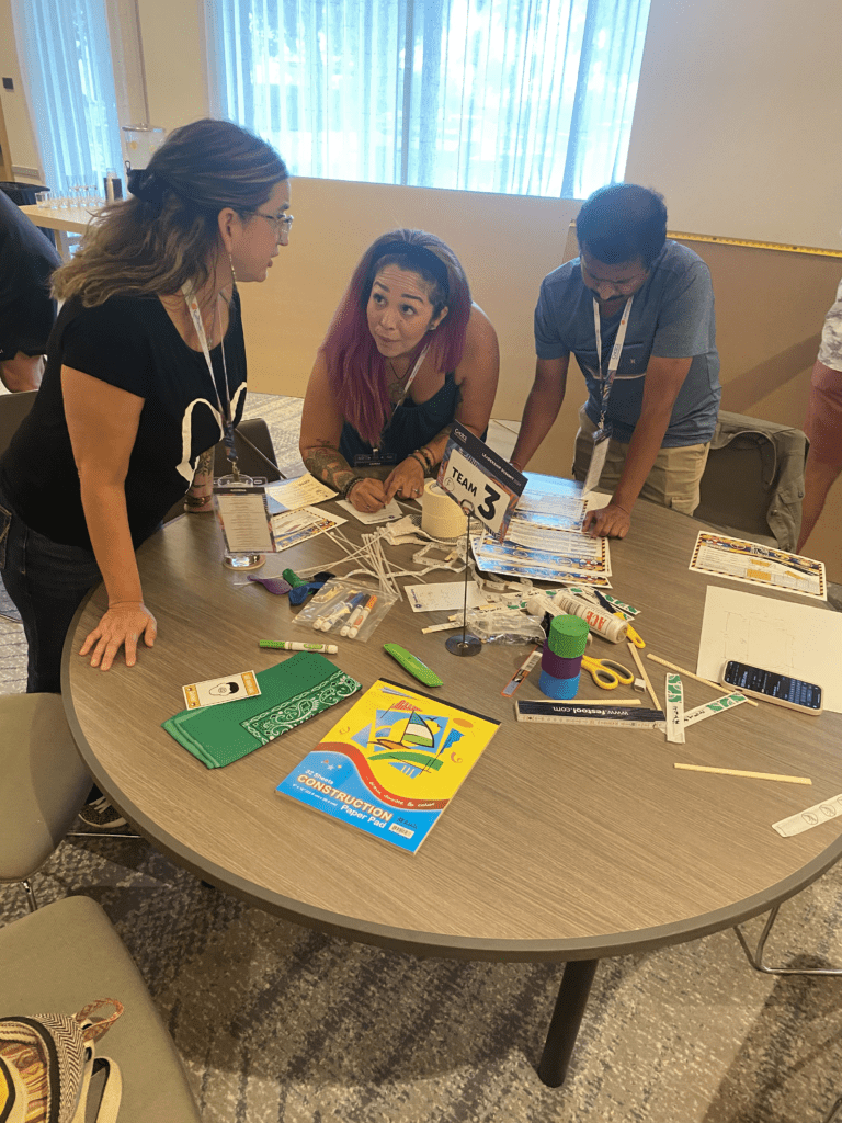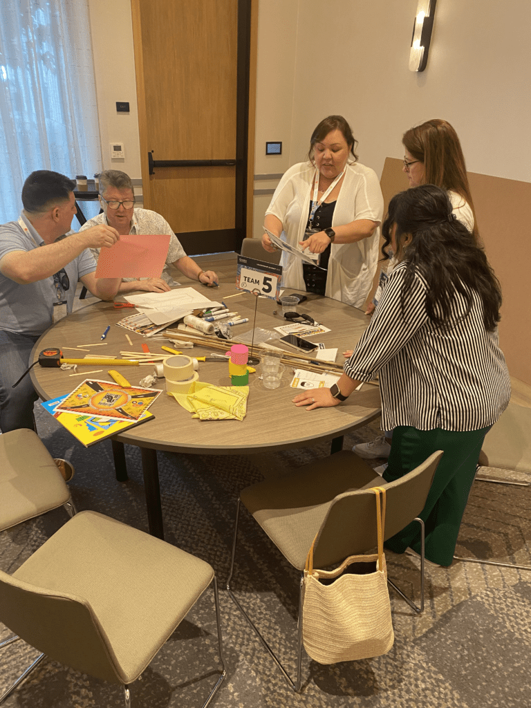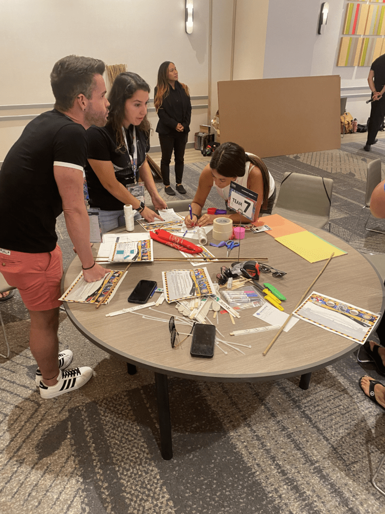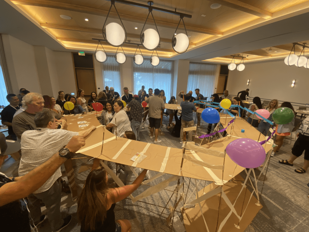 This indoor activity works best in a large, private function room with a good amount of open space. Team tables are optional when space allows. You’ll also want 4 large rectangular tables at the front of the room to hold all the bridge building materials. For groups larger than 50 people, we’ll need a microphone and speaker setup, and strongly suggest a riser for an elevated stage.